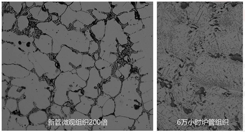 在高温使用中,骨架状的M7C3共晶碳化物很快会全部转变成M23C6并随温度提高而速在长期高温服役后,骨架状共晶碳化物会转变成网链状,运行温度越高,时间越长,网链状越明显,说明组织劣化越严重。